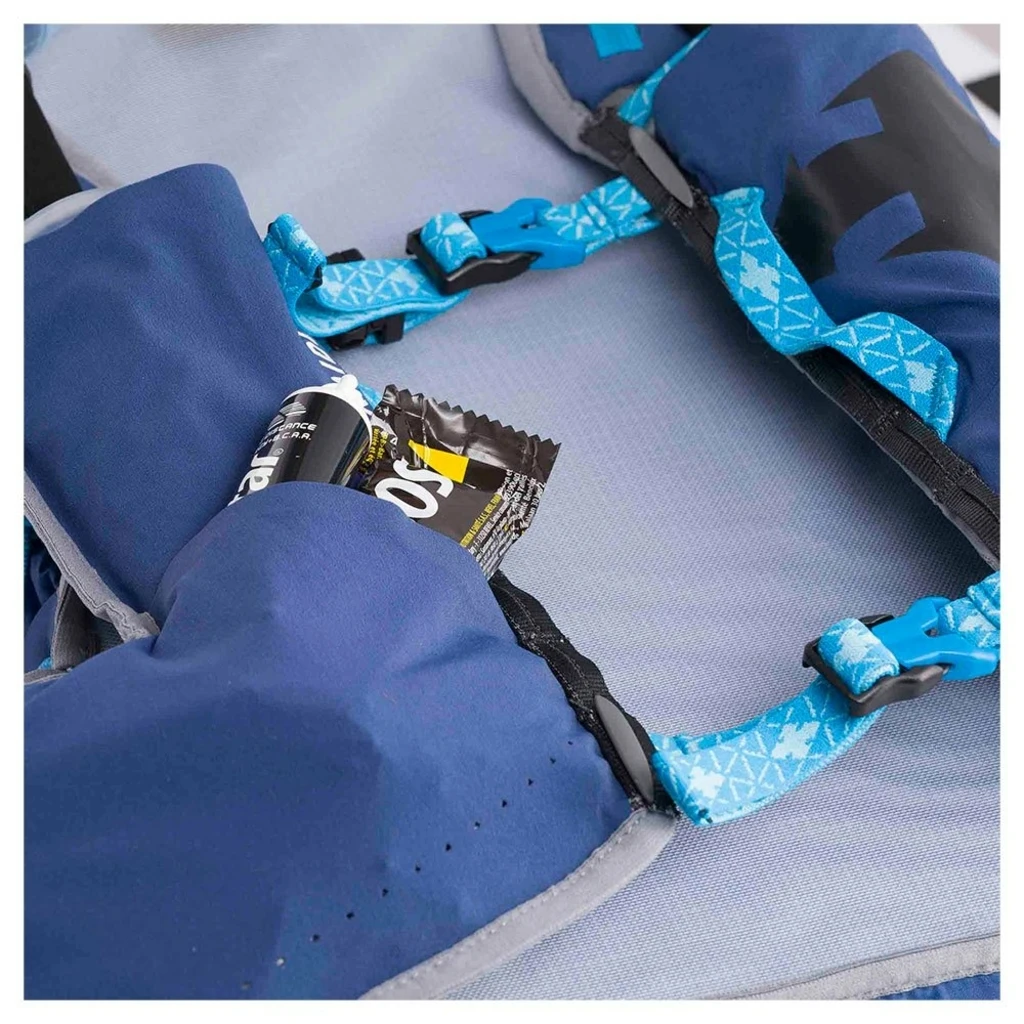 Ce sac de forme anatomique de type gilet se porte haut sur les épaules. Il s’ajuste parfaitement à votre morphologie grâce à son tissu stretch et à son système de serrage par boucles latérales micrométriques. Les moindres ballotements sont évités. La grande poche principale de 15 litres est compatible avec une poche à eau, selon vos besoins. Vous disposez d’un total de 11 poches, dont des poches porte-bidons au placement stratégique. Vous apprécierez le système pratique d’attache de bâtons, les coutures plates, le sifflet de sécurité et les éléments réfléchissants pour la visibilité par faible luminosité.