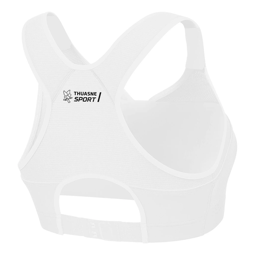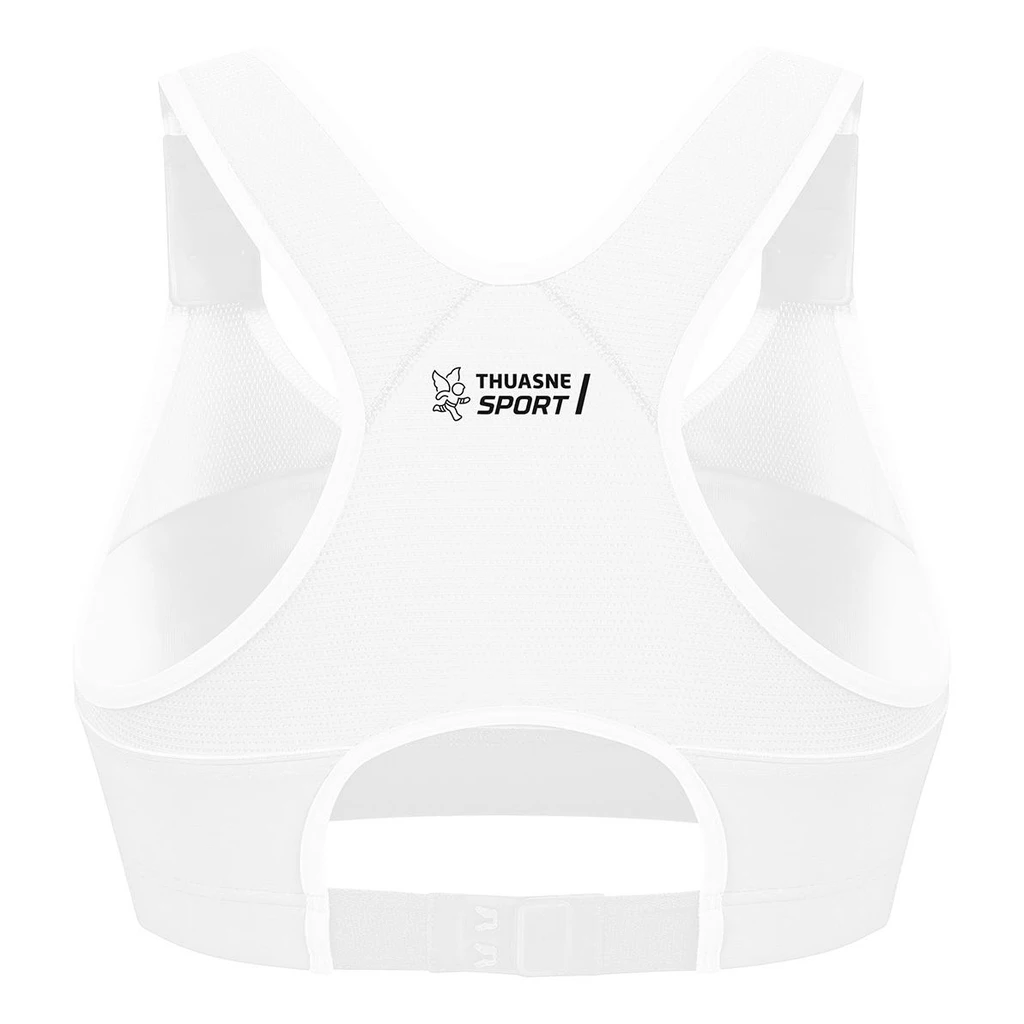 Cette brassière fait partie de la gamme maintien extrême de Thuasne. Ceci repose sur l’alliance de tissus élastiques hautement performants et d’une maille bloquée qui s’adaptent à la morphologie, mais aussi sur la bande élastique large sous la poitrine.